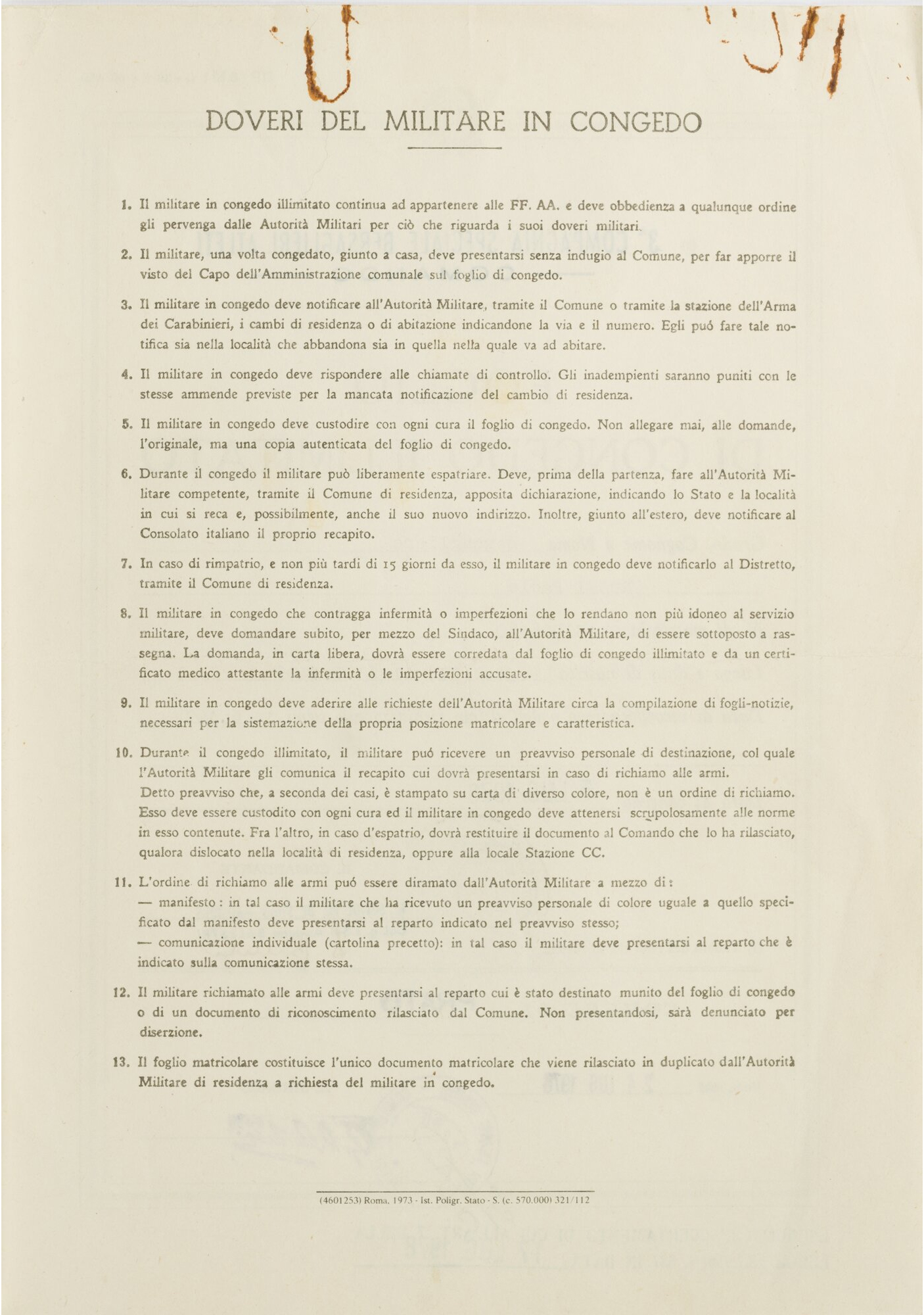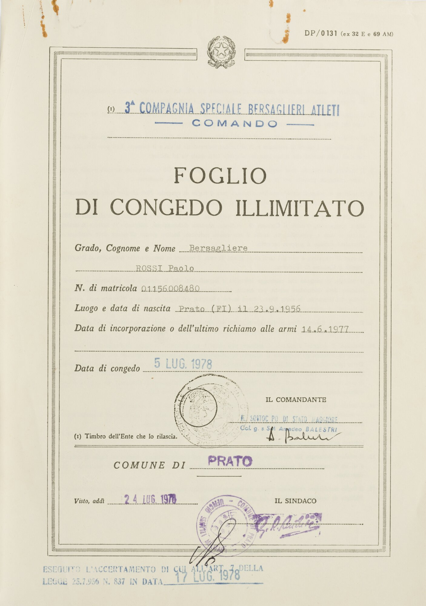FOGLIO DI CONGEDO ILLIMITATO 3ª COMPAGNIA SPECIALE BERSAGLIERI ATLETI