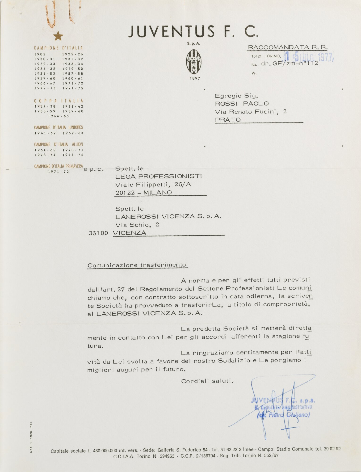 COMUNICAZIONE DI TRASFERIMENTO IN COMPROPRIETÀ DALLA JUVENTUS ALLA L.R. VICENZA